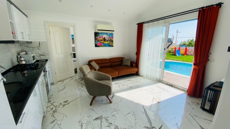 Villamız, şık ve modern şekilde dekore edilmiş iki yatak odasına ve iki banyoya sahiptir. Birinci yatak odasında çift kişilik yatak, jakuzi, banyo ve klima; ikinci yatak odasında ise iki tek kişilik yatak, banyo ve klima bulunmaktadır. Geniş salon alanında oturma grubu, tam donanımlı mutfak, klima ve televizyon yer almaktadır. Ayrıca, villada bulunan langırt masası, çocuk oyun alanı ve salıncak sayesinde eğlenceli vakit geçirebilirsiniz.