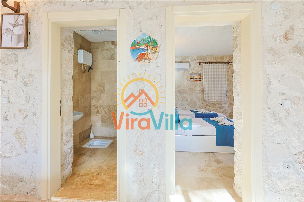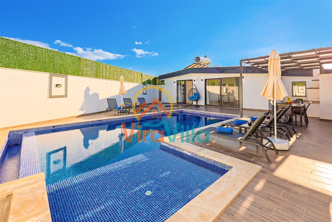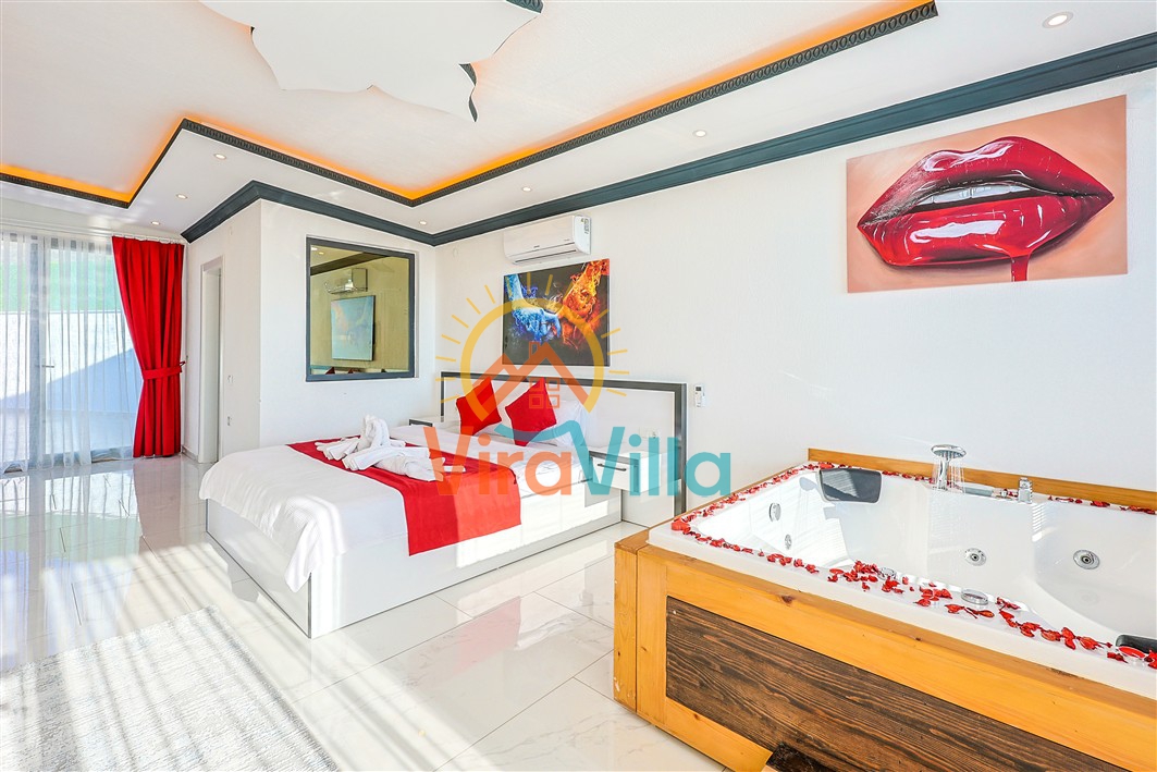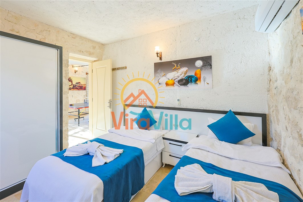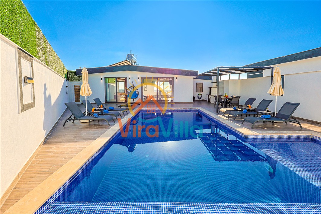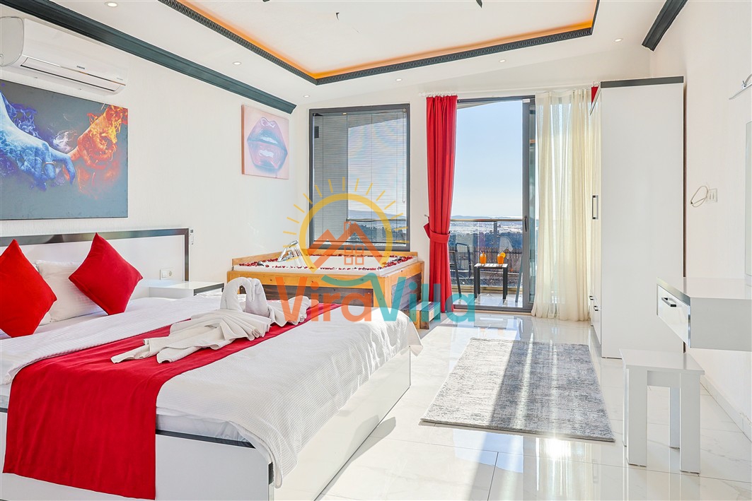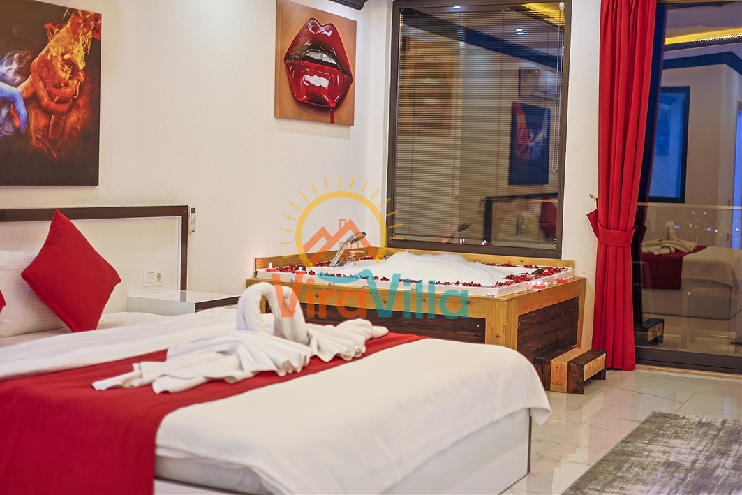 Not 2:Villamız 2 katlıdır ve havuz terası üst katta yer almaktadır. Üst katta salon mutfak ve jakuzili 1 yatak odası yer almaktadır, alt katta ise 2 yatak odası daha mevcuttur. Alt katta yer alan yatak odalarından bir tanesinde cam ve pencere yoktur ve güneş almamaktadır. Bu nedenle villa kapasitesi 4 kişilik olarak belirtilmiştir. İsteğe bağlı olarak 3. yatak odası açılabilir ve kapasite 6 kişiye çıkartılabilir.